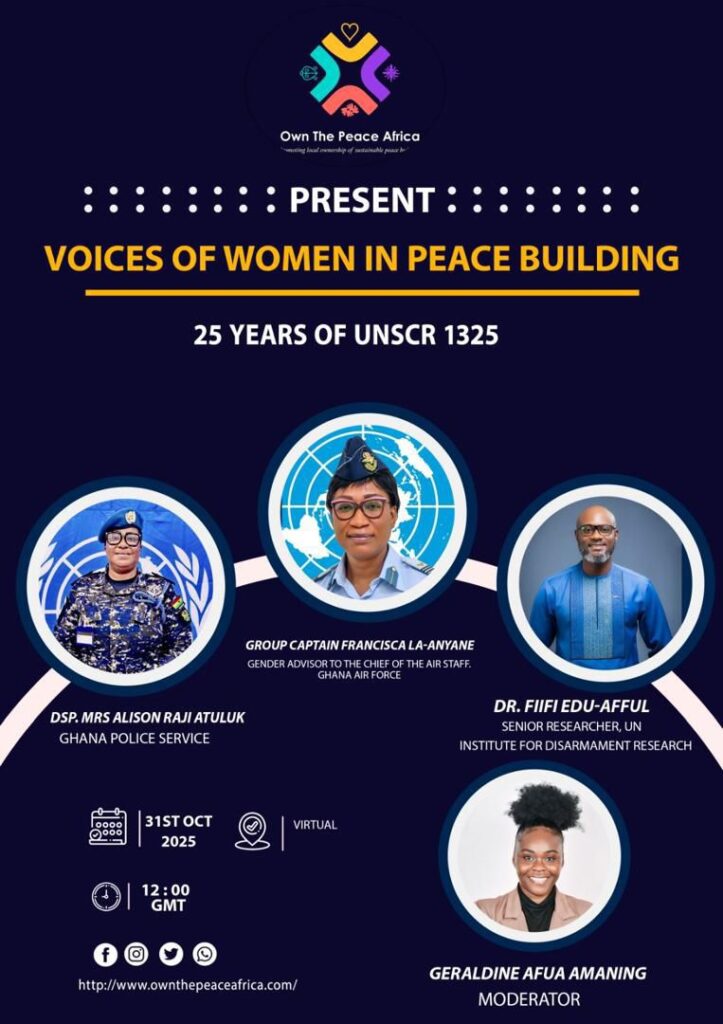 The global community continues to witness how women shape peace in ways that transform families, communities, and nations. Despite this, women’s roles in formal peace processes remain undervalued and underrepresented. To confront this ongoing gap and renew momentum behind the Women, Peace and Security agenda, Own the Peace Africa convened an online dialogue last Friday bringing together Group Captain Francisca La-Anyane of the Ghana Armed Forces, a Gender Advisor with over 22 years of service and extensive UN peace support experience; DSP Mrs. Alison Raji Atuluk of the Ghana Police Service, a distinguished peacekeeper currently serving with MINUSCA in the Central African Republic and the first woman to command the UN parade there; and Dr. Fiifi Edu-Afful, a peace and security scholar-practitioner with over 15 years of experience who currently serves as Senior Researcher and Pillar Coordinator for Preventing Armed Conflict and Armed Violence at the United Nations Institute for Disarmament Research (UNIDIR) to reflect on what has been achieved, what work still lies ahead, and how women’s voices can take their rightful place at the heart of peace building efforts across the continent.